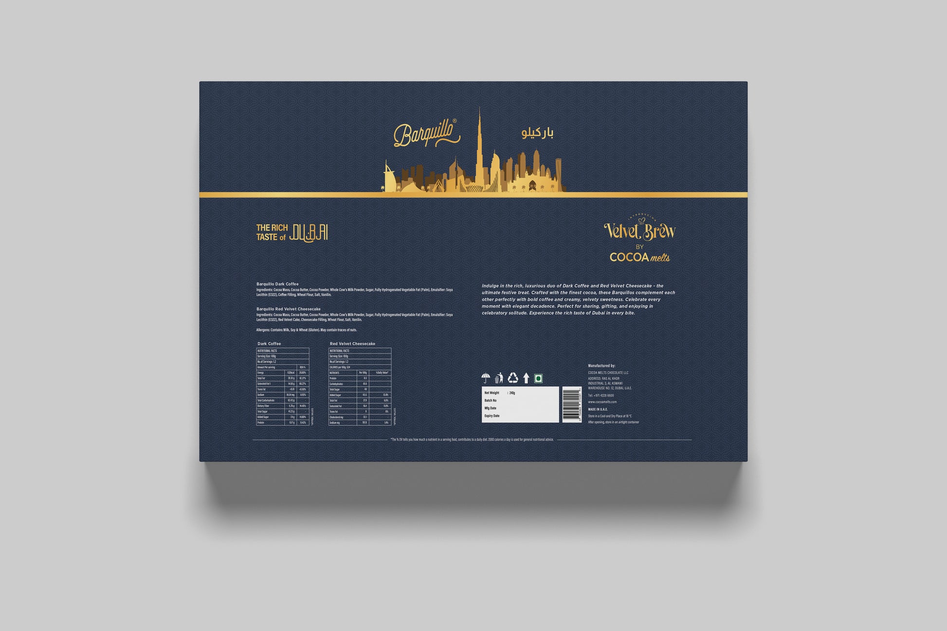 Indulge in the rich, luxurious duo of Dark Coffee and Red Velvet Cheesecake - the ultimate festive treat. Crafted with the finest cocoa, these Barquillos complement each other perfectly with bold coffee and creamy, velvety sweetness. Celebrate every moment with elegant decadence. Perfect for sharing, gifting, or enjoying in celebratory solitude. Experience the rich taste of Dubai in every bite.