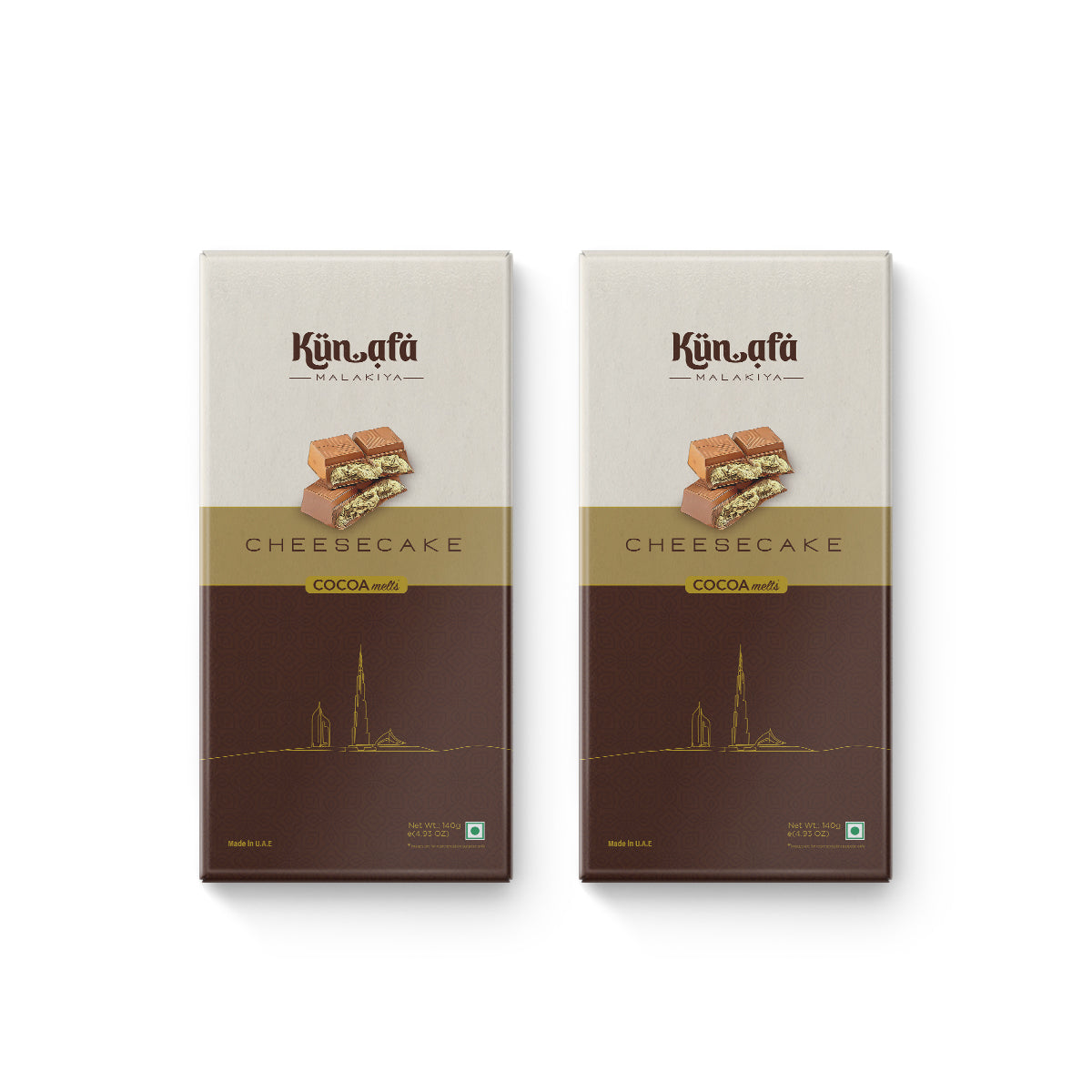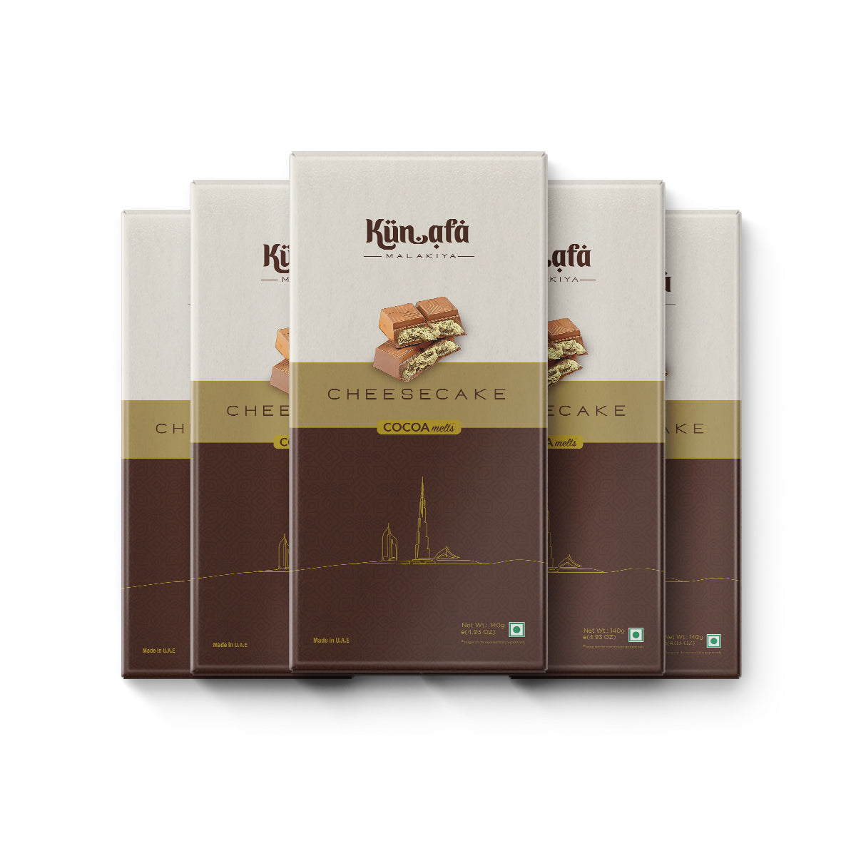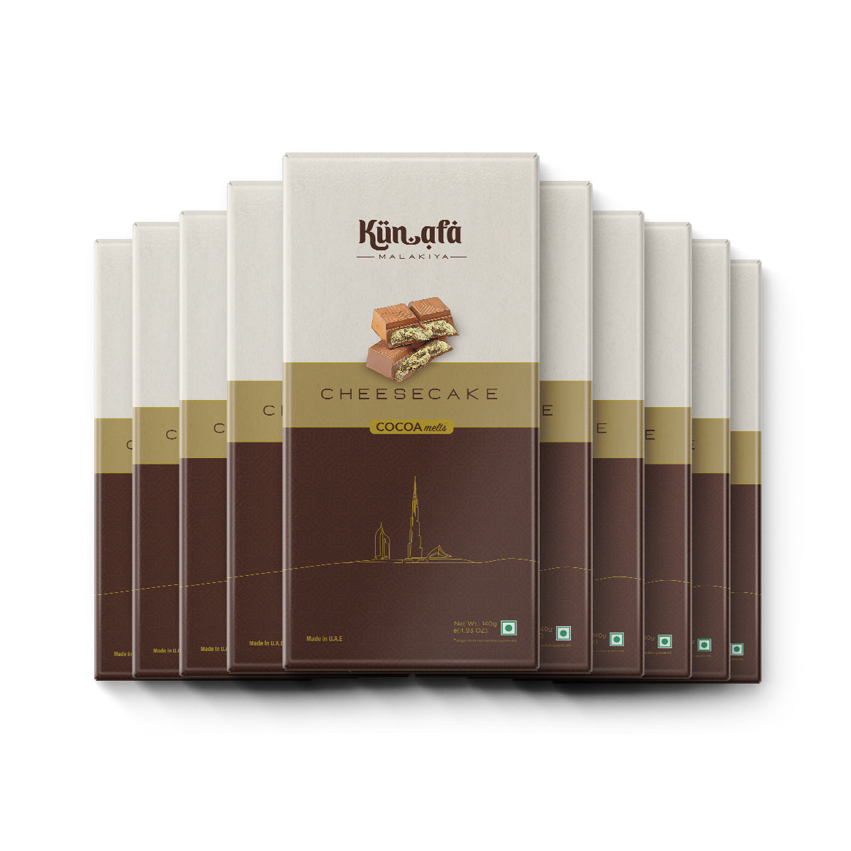 Crunchy Kunafa meets creamy cheesecake filling, covered in Belgian chocolate for the perfect sweet escape. With the richness of cheesecake and the melt-in-the-mouth texture of chocolate, this flavour is a celebration of contrasts. Let every bite take you on a creamy, crunchy, chocolaty ride. Discover our Cheesecake Kunafa Chocolate from Dubai today!